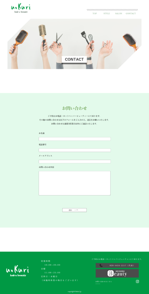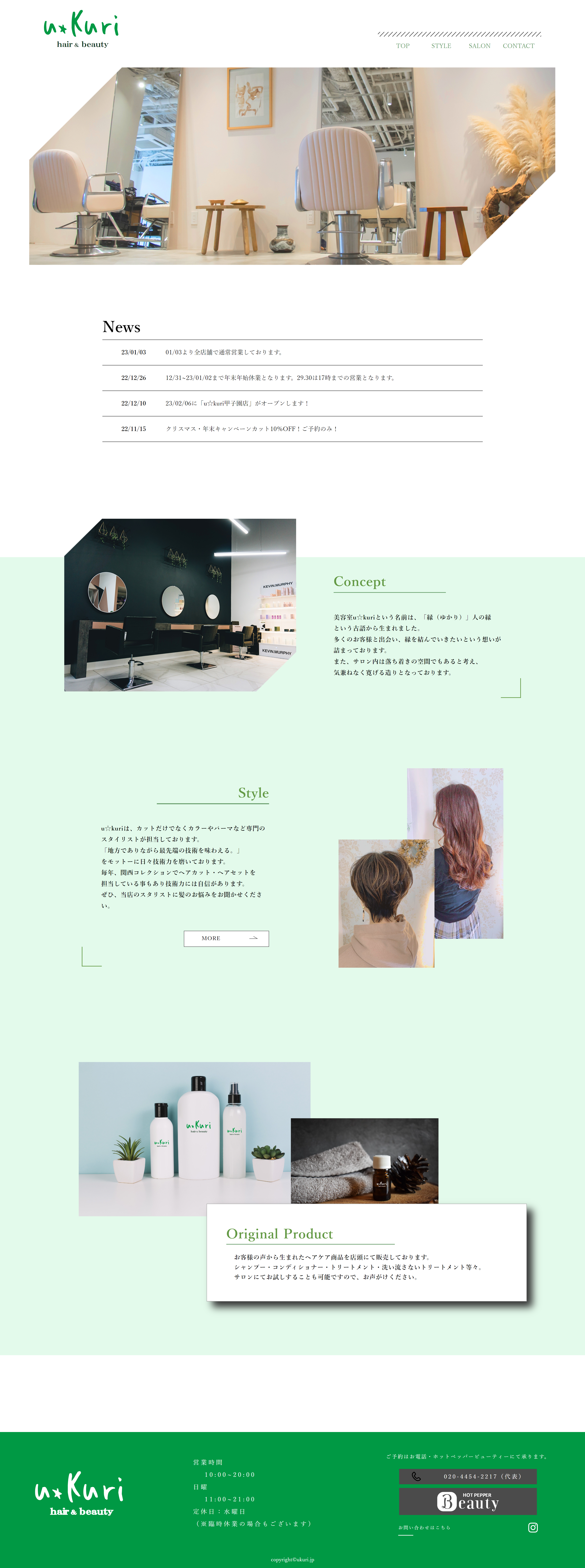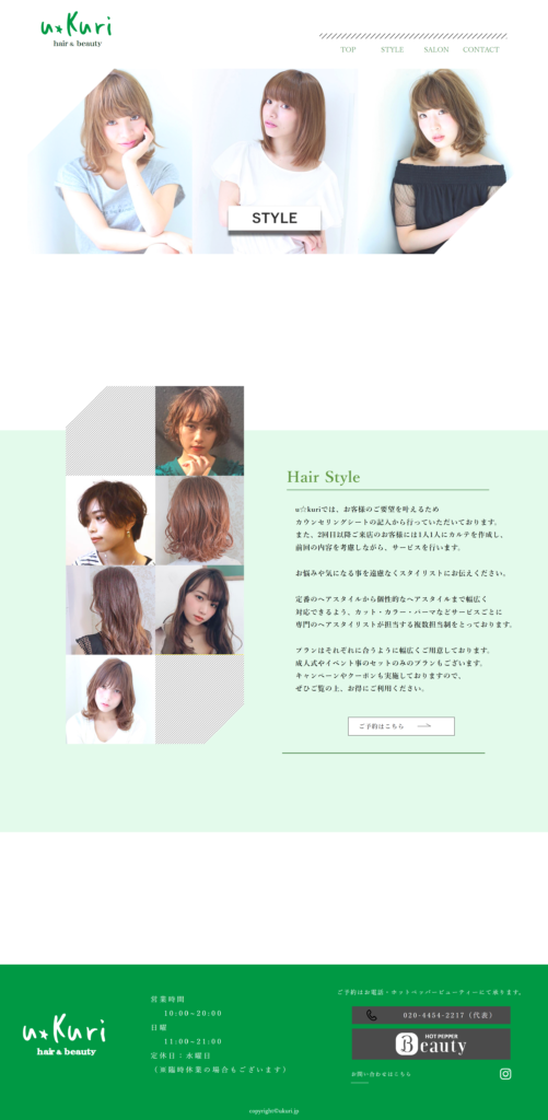 職業訓練の実習先での架空サイト制作の作品。美容室ukuriのリニューアルを依頼されたという形で企画からコーディングまで実施。